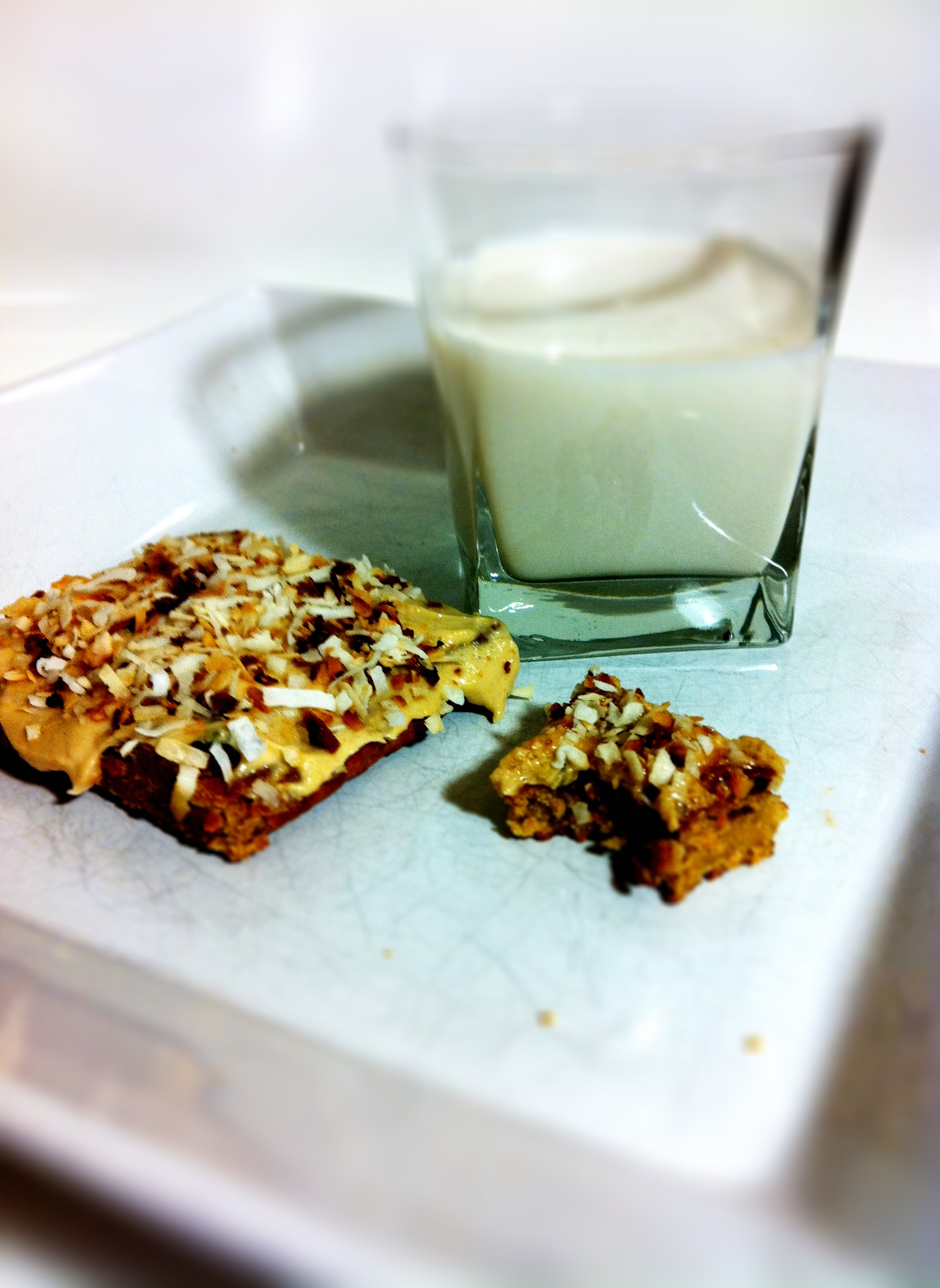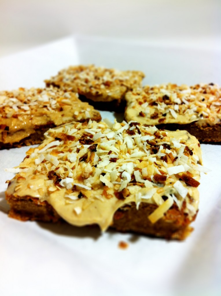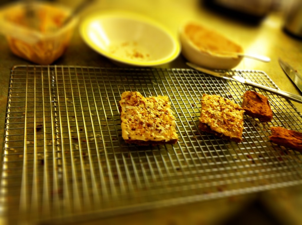 - Spread evenly over squares and sprinkle with toasted coconut.