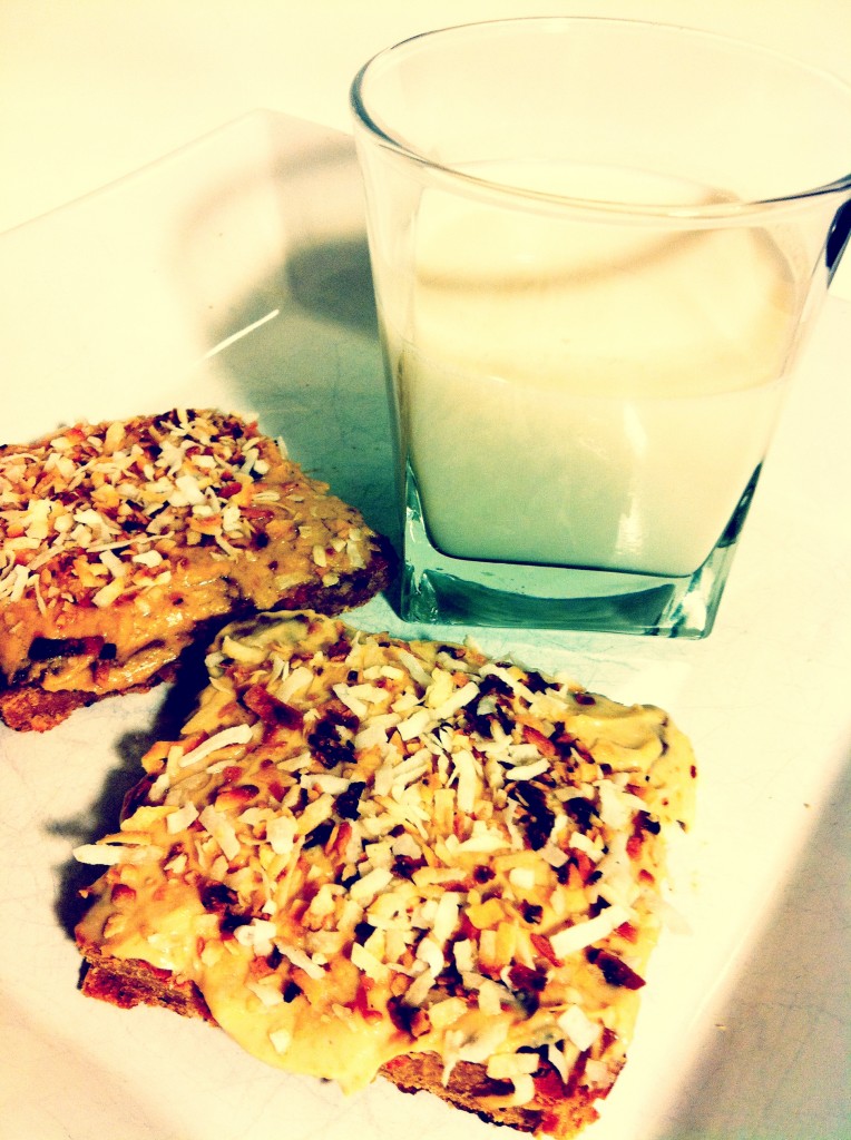 - Toast your coconut (unsweetened/shredded) in a small frying pan over medium-low heat. Sprinkle coconut with 1 packet of stevia before adding to the food processor (save some toasted coconut for topping).
